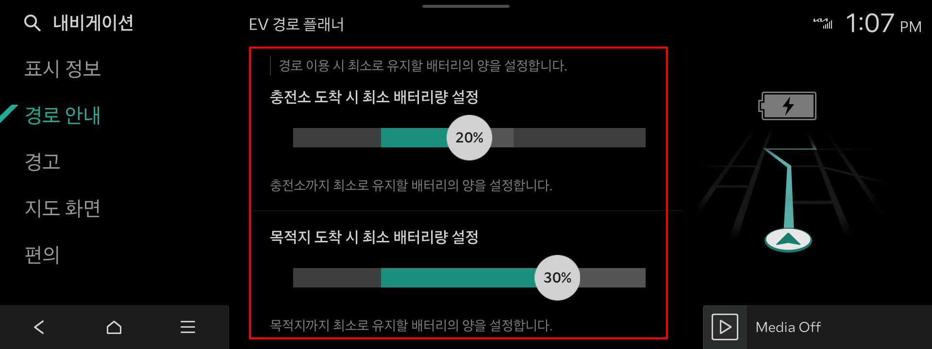 A12. 도착 시 남겨둘 배터리량을 설정해 두면, 내비게이션이 그 값을 고려해 경로를 추천해 줘요. 배터리 방전 걱정을 줄일 수 있어요.
